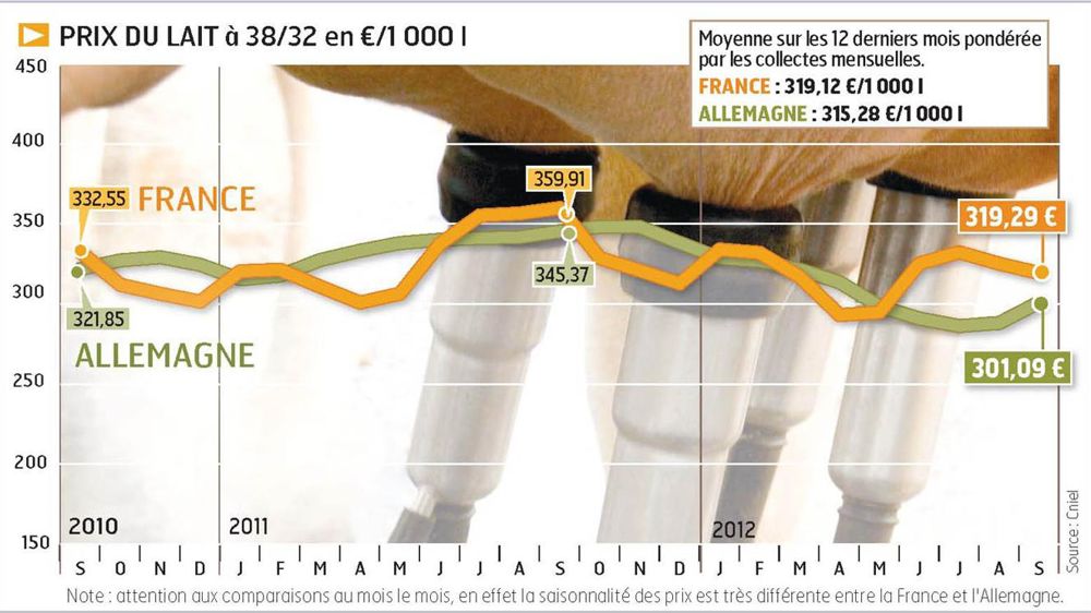 Le prix plancher de juillet-août (271 à 287 €/1 000 l de lait à 38/32) est désormais loin. La hausse a été très sensible dans le Nord et l'Est. Depuis août, les laiteries du Nord ont boosté leur prix de 19 et 25 €/1 000 l en septembre et octobre pour arriver à 324 €. Celles de l'Est sont sur la même tendance avec deux hausses de 16 et 17 €, à 304,67 €/1 000 l. Les producteurs de l'Ouest ont moins gagné, mais tout de même plus de 27 € en deux mois, à 298,89 €. Même la Muh, grosse exportatrice de lait UHT à prix cassé suit le mouvement (+35 € à 294 €/1 000 l). La hausse est moindre dans le Sud : 17 €/1 000 l à 305 €/1 000 l.