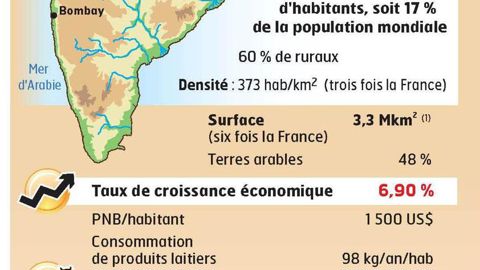 L'Inde se plaît à dire qu'elle est le numéro un mondial du lait avec 120 milliards de litres (trois fois plus que la Chine). Le pays gagne près de 20 millions d'habitants par an. Sa croissance économique soutenue depuis une dizaine d'années a permis de faire émerger une classe moyenne qui accroît sa consommation de lait.