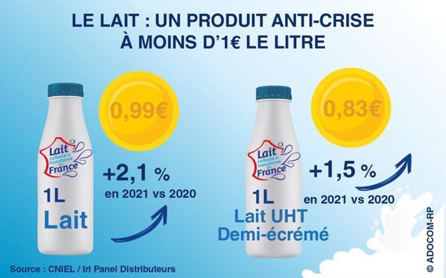 Simultanément, les transformateurs subissent une hausse des coûts de production (énergie, emballages, transport, lait) de 8 à 10 %, et estimée entre + 15 % et + 20 % en 2022. « Nous devons absolument crever ce plafond de verre de 1 € le litre de lait. Sinon, la filière sera en danger et ne pourra plus assurer la souveraineté alimentaire de la France. Rappelons que 98,5 % du lait consommé est collecté et conditionné en France. La baguette de pain, la boîte de six œufs sont à plus de 1,10 ou 1,20 €. Pourquoi pas le lait qui, à ce prix, reste une source de protéines encore très abordable ? », insiste Éric Forin, président de Syndilait.