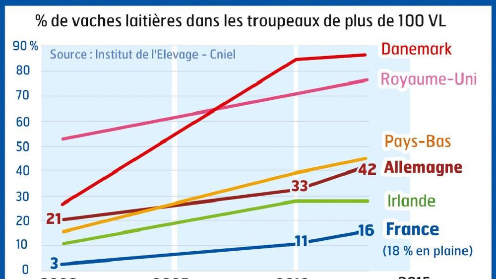 L'agrandissement est clairement en marche en France comme chez ses voisins. C'est ce qu'a constaté Christophe Perrot, économiste à l'Institut de l'élevage, lors de la journée Dairyman, à Rennes (Ille-et-Vilaine), début avril :« En France en 2013, 16 % des vaches vivent dans des troupeaux d'au moins 100 vaches laitières, contre 3 % en 2000. » La tendance à l'agrandissement est manifeste, mais avec des différences. La France et l'Allemagne restructurent plus vite, avec une baisse du nombre d'élevages de, respectivement, 5,1 % et 4,1 %/an entre 2007-2008 et 2012-2013. Le taux ralentit en Irlande, car la politique volontariste a conduit à créer de nouveaux élevages. On constate un coup d'arrêt au Danemark, dû à la crise de 2009 qui a stoppé les investissements des gros élevages. Une analyse plus fine montre des écarts marqués entre les régions en France et en Allemagne. En Bavière, seulement 8 % des vaches se trouvent dans des troupeaux de 100 vaches laitières ou plus contre 51 % en Basse Saxe. Elles sont 28 % en Poitou-Charentes, ou 25 % en Bourgogne, mais 14 % en Bretagne et 8% en montagne-piémont.
