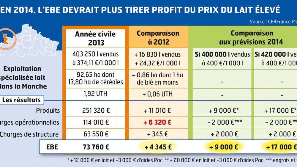Bilan 2013 en demi-teinte pour les exploitations spécialisées lait. Dans la Manche, premier département laitier, la double conjoncture laitière « prix-volume » favorable est grignotée par le recul des produits viande et céréales de 5 000 €. Côté charges, l'année fourragère délicate et la hausse du prix des aliments pèsent sur les charges opérationnelles (voir ci-contre), avec un accroissement du poste aliments de 11 %. « Avec 374,11 €/1 000 l en moyenne sur les clôtures comptables de décembre 2013, le prix du lait n'a jamais été aussi haut cette décennie, rappelle Xavier Beaufils, de CERFrance Manche. Il génère une hausse du chiffre d'affaires de 10 000 €. Les 4,3 % de lait livré en plus par rapport à 2012 se traduisent par un supplément de 6 000 €. » Au final, l'EBE progresse légèrement, tout comme le revenu disponible qui atteint 29 100 € (16 830 €/UTAF). « Malgré tout, le déficit de trésorerie de 2012 perdure. Les producteurs ont contracté des prêts à court terme à hauteur de 10 000€. » Heureusement, l'année 2014 s'annonce sous de meilleurs auspices. Le contexte fourrager et des intrants est plus favorable tandis que le prix du lait continue d'augmenter. Selon le centre de gestion, il flirtera avec les 400 €/1 000 l (370 € de prix de base + 30 € de qualité). Du jamais vu ! « Cela permettra de reconstituer les trésoreries. Les plus performants devraient pouvoir se créer un trésor de guerre. »