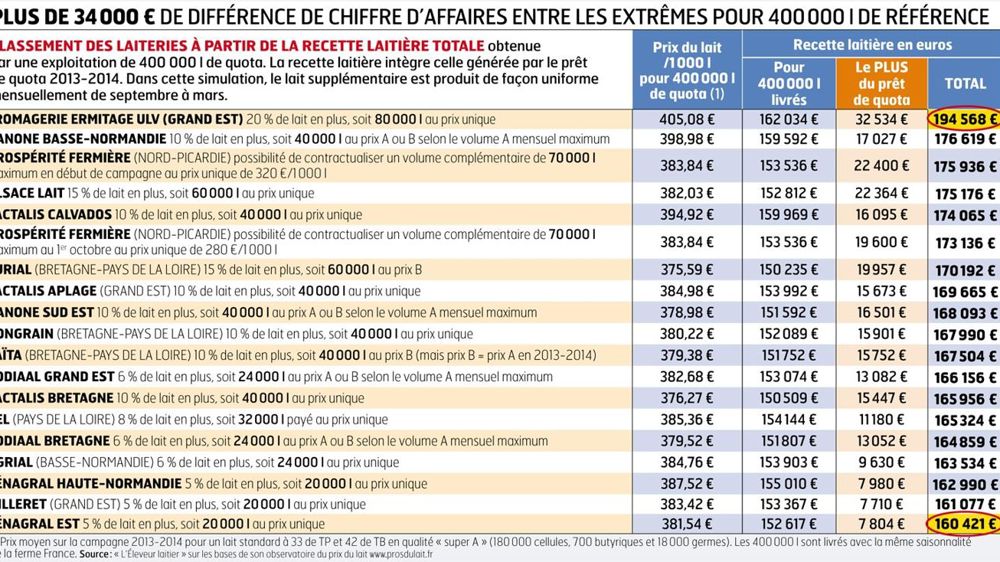 Le référentiel des prix du lait de L'Éleveur laitier met en évidence la politique de prix des entreprises. Il n'intègre pas en routine leur politique de volume. C'est chose faite dans cette simulation avec les laiteries ci-dessous qui illustrent la diversité des stratégies en 2013-2014. Comme l'an passé, la recette laitière générée par le prêt de quotas est jusqu'à quatre fois supérieure entre les extrêmes... sauf qu'en euros, les écarts sont plus importants : 24 800 € contre 14 000 € en 2012-2013. Amplifié par la hausse du prix du lait, l'effet « rallonge » joue à plein. Selon les entreprises, l'allocation va de 5 à 20 %. Évidemment, les grands gagnants sont les producteurs qui cumulent volumes et prix dans le top français (Danone Basse-Normandie grâce à la prime saisonnalité et L'Ermitage). Notons aussi que La Prospérité Fermière et sa politique innovante de volumes fournissent une recette complémentaire de l'ordre de 20 000 €. Cela demande aux « Prospé » de bien connaître en amont leurs coûts de production, qui sont l'autre composante du revenu.