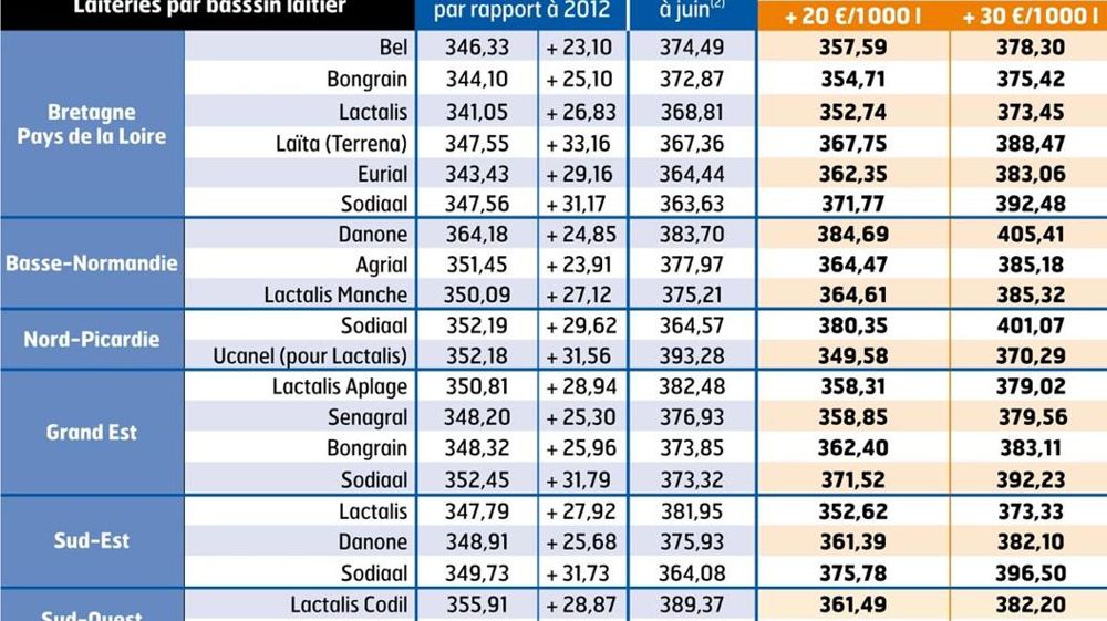 D'où des prix depuis janvier déconnectés de ces indicateurs. Il y a aussi celles qui les ont suivis à la lettre (tout en lissant), avant de se raviser. Exemple, avec Lactalis qui depuis mai fait des entorses à ce qui est écrit dans ses contrats sur la détermination du prix de base. Facile pour elle de se justifier en pointant du doigt Sodiaal.Mais s'il est juste que cette dernière a moins payé que Lactalis depuis six mois, le fait est qu'en 2013, Sodiaal l'avait plus augmenté qu'elle (2 à 4 €/1 000 l selon les régions). D'une façon assez générale, on observe d'ailleurs que le prix du lait moyen payé de janvier à juin est inversement proportionnel à l'augmentation de prix consentie l'an dernier. Il n'y a pas de miracle en économie.