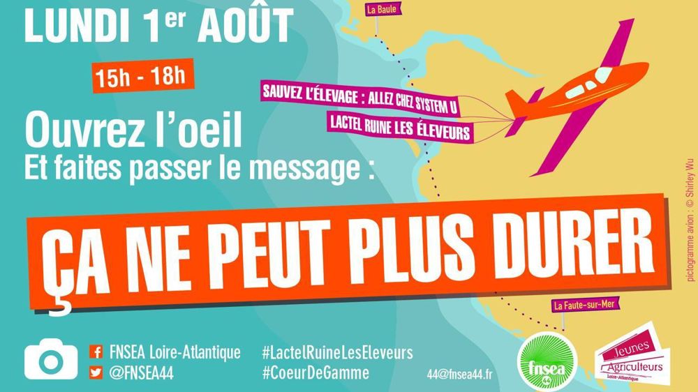 Sur le terrain, les éleveurs de l'Ouest de la France poursuivent leur mobilisation. En Vendée ce 1er août 2016, la FDSEA a fait passer un avion tirant une banderole relayant leur message à l'encontre de Lactalis, le long des plages entre la Baule et Faute sur Mer. Le ton monte, et les communiqués pleuvent.