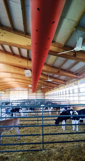 REDCLOUD, LE NOUVEAU SYSTÈME DE VENTILATION proposé par CowHouse met le bâtiment des jeunes veaux en surpression pour renouveler l'air. Il se compose d'un ventilateur, placé à l'extérieur, et d'une gaine percée qui court à l'intérieur de la nurserie. Sa position et le nombre de trous sont en fonction de la surface du bâtiment, du nombre et de l'âge des veaux. L'objectif est d'atteindre une vitesse de 0,3 mètre par seconde sur une hauteur de 1,20 m. Ce mouvement d'air venu de l'extérieur entraîne une surpression et fait s'échapper l'air vicié. Tout l'air du bâtiment est ainsi renouvelé en moins de six heures.