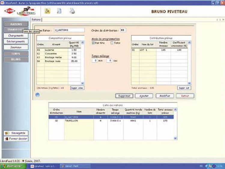 IL S'AGIT D'UN KIT QUI PEUT ÉQUIPER aussi bien une mélangeuse traînée qu'une désileuse mélangeuse automotrice. Le terminal T75, placé en cabine, est associé au logiciel Librafeed avec, pour interface, un support USB. Le logiciel permet de réaliser les rations et de programmer le temps de mélange nécessaire aux différents ingrédients. Ces données seront transférées dans le terminal. En retour, l'éleveur connaîtra la quantité exacte distribuée pour chaque lot (gestion des stocks plus précise) et le temps exact passé à la réalisation de ce mélange (pour sa qualité). Le logiciel inclut une gestion individuelle des chauffeurs et un suivi des entretiens de la machine. En Cuma, le comptable connaît donc la durée de travail exact de chacun des adhérents, pour une facturation plus juste. Toutes ces données ne sont plus uniquement accessibles depuis la cabine de la machine, mais depuis le bureau de l'éleveur. Celui-ci connaît, en un clin d'oeil, la consommation aliment par aliment. Il a surtout la garantie d'une ration homogène et de qualité quel que soit le jour ou la personne qui la distribue.