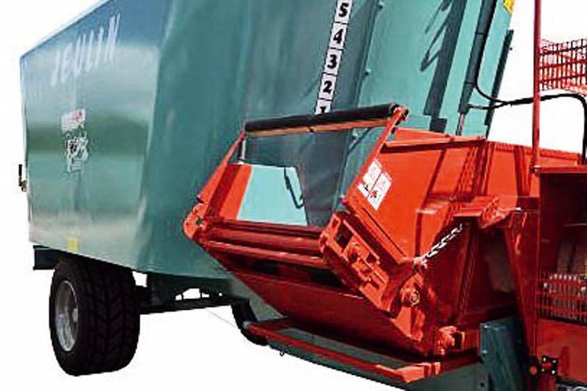 DU NOUVEAU DANS LES ÉQUIPEMENTS DESTINÉS AUX MÉLANGEUSES et mélangeus-espailleuses à vis verticales de la société Jeulin. Le fabricant et concepteur a mis au point un nouveau tapis appelé le « tapis banane ». Il s'agit d'un équipement complémentaire qui autorise une distribution à gauche ou à droite, avec un déport hydraulique qui permet d'adapter la hauteur de distribution du mélange sur la table d'alimentation. En position de travail, au fur et à mesure de la distribution, le tapis se déporte pour être à la hauteur de l'auge. La distribution est possible jusqu'à un mètre du sol. Lorsque l'attelage est en position de circulation, le tapis se rabat de façon à ne pas dépasser la largeur de la mélangeuse. Ce dispositif est disponible pour tous les modèles de la marque Jeulin, pour un montage à l'avant ou à l'arrière sur les mélangeuses Energy et Activa F2, et à l'arrière pour Aéromel et Boramel.