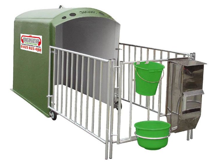 La nouvelle niche à veau individuelle de Beiser possède une coque en fibre de verre renforcée et une toiture isolée (20 mm de polyuréthane) pour une meilleure isolation. Une protection en polyester sur l'ouverture de ventilation arrière évite les courants d'air. Le parc galvanisé devant la niche est relevable pour simplifier le nettoyage. Son portillon est facilement déplaçable contre l'entrée de la niche afin de pouvoir y bloquer le veau pendant la première semaine avant qu'il ne profite du parc. Cette niche est commercialisée avec un seau à tétine, un seau de 20 l, les porte-seaux et un nourrisseur à fibres et granulés en Inox. Elle est également disponible avec un caillebotis recouvrant l'intégralité du sol pour maintenir la surface au sec. La niche bascule vers l'avant pour en assurer le nettoyage intérieur et un crochet de levage permet de déplacer l'ensemble.