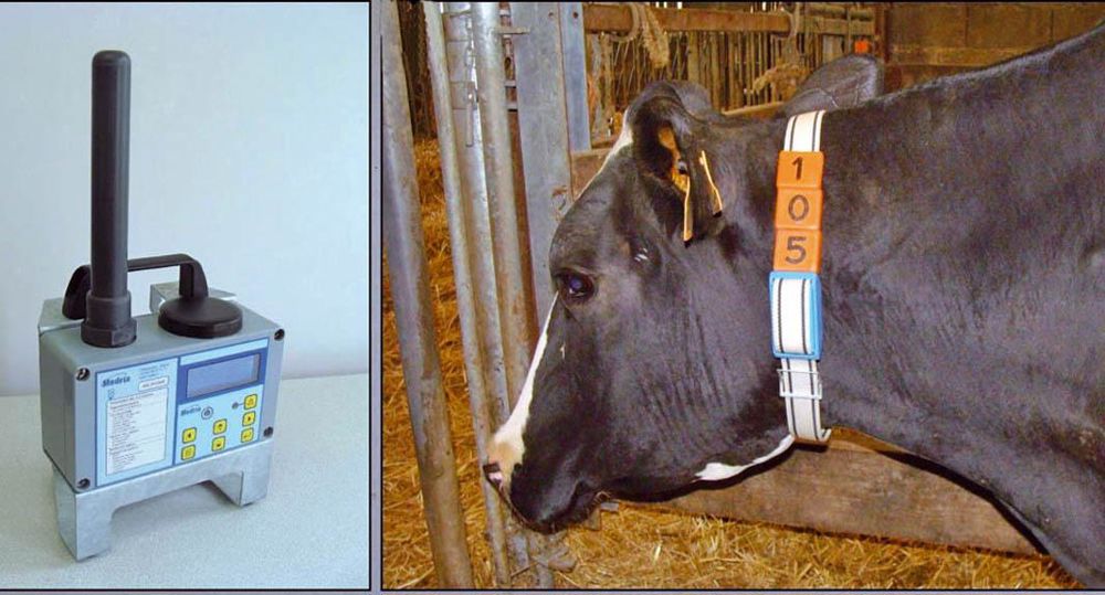 POUR UNE CAPACITÉ À DÉTECTER LES CHALEURS SUPÉRIEURE À 85 %, Médria propose le Heat Phone. Il s'agit d'un boîtier monté sur le collier de chaque animal qui intègre un accéléromètre trois axes qui enregistre tous les 15 min la fréquence et l'amplitude des mouvements de l'animal. Les données sont transmises toutes les heures à la base radio GSM de Médria. C'est un équipement standard chez Médria qui sert aussi au Vel Phone (détection des vêlages par sonde vaginale) et au Thermo Bolus (suivi de la santé). Les relevés d'activité sont retransmis par liaison GSM-GPRS au serveur informatique développé par Médria. C'est à ce niveau que sont archivées et analysées toutes les données zootechniques et notamment l'activité de l'animal corrigée de l'activité moyenne du troupeau. Dès qu'une activité dépasse le seuil établi, l'éleveur est averti par SMS. Sur son ordinateur, par internet, il peut aussi consulter le tableau de bord journalier zootechnique et sanitaire de son élevage et notamment les courbes d'activité produites par le Heat Phone.