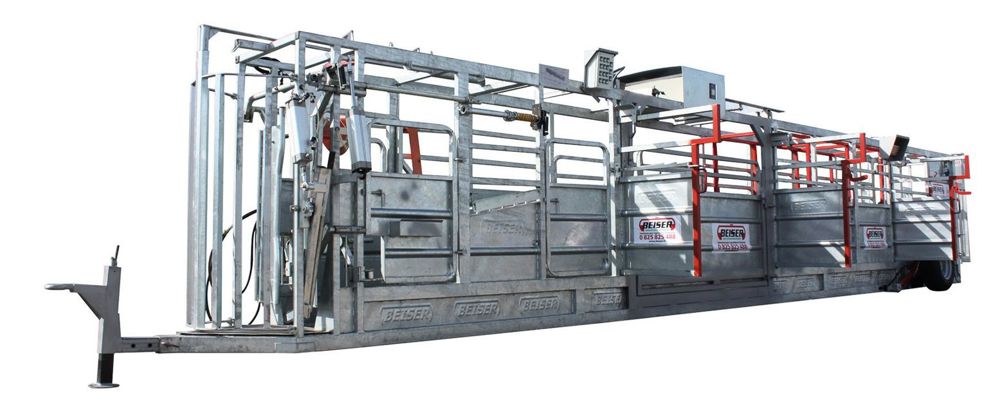 SES 12 MÈTRES DE LONGUEUR SUR 1 MÈTRE DE LARGE AVEC QUATRE MODULES (stockage, pesée, tri et contention) permettent de traiter quatre animaux en même temps. L'automatisation des portes et de l'avancée des animaux, grâce à une télécommande, permet de gérer le tri, les traitements et les interventions à une seule personne. Le module de pesage, véritable cage dans la cage, autorise une pesée précise jusqu'à 1 500 kg. La partie avant possède une cage de contention permettant tous les traitements (sangles ventrales, barre antirecul, treuil pour levage des pattes). Enfin, ce couloir est doté d'un réducteur de largeur actionné automatiquement, ce qui le rend adapté à tous types de bétail.