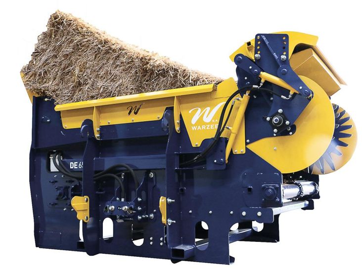 Warzée propose une démêleuse pailleuse conçue pour distribuer et pailler des balles cubiques de foin, paille et enrubanné. La caisse est munie d'un fond poussant à chaîne et d'un rotor à spirale capable de projeter la paille à 15 mètres. Le capot déflecteur autorise soit le paillage, soit la formation d'un andain. Le tablier pique-bottes permet de poser la balle dans la machine et de l'atteler sans intervention manuelle, grâce à l'accrochage automatique hydraulique. Une télécommande à distance actionne le rotor, la position du capot et l'avancement du tapis. Le constructeur assure que le paillage s'effectue sans broyage, donc avec moins de poussières.
