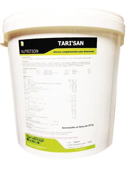 TARI'SAN EST UN ALIMENT COMPLÉMENTAIRE pour vaches taries qui se présente sous forme de semoulette à mélanger à la ration. Il contient à la fois les minéraux et les oligoéléments nécessaires à la production d'un colostrum de qualité, des vitamines, un hépato-protecteur assurant un nettoyage du foie, des levures vivantes pour stimuler la flore du rumen et par conséquent l'ingestion en début de lactation, le tout avec une Baca négative permettant de maîtriser le risque de maladies post-partum et notamment les fièvres vitulaires. Là où plusieurs produits sont souvent apportés séparément, cette formule complète permet d'effectuer une seule distribution, simple et rapide, à raison de 100 g/vache lors des quarante premiers jours et de 250 g les vingt derniers jours de tarissement, ou encore de 150 g/vache/j pendant toute la phase de tarissement, soit 9 kg/vache.