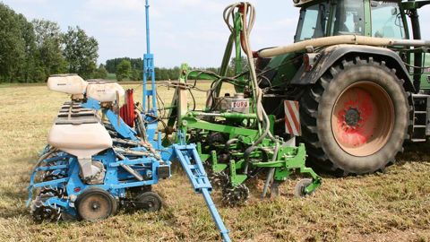 Les plus audacieux se permettent de passer le strip-till en combiné avec le semoir monograine derrière une dérobée, sitôt l'ensileuse sortie du champ. La prairie (souvent du ray-grass italien) est alors détruite par un passage de glyphosate en post-semis. © D.G.