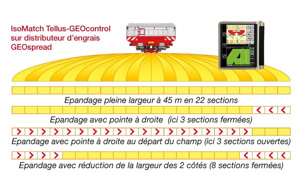 Le terminal universel Isobus, IsoMatch Tellus, est le pilier du système iM Farming. C'est un boîtier de grand format disposant d'un double écran tactile. Il permet de contrôler simultanément deux machines ou d'afficher à la fois le réglage de l'outil et le guidage GPS auquel il peut se connecter. Toutes les applications de l'agriculture de précision sont possibles avec ce terminal, et notamment le GEOcontrol qui permet les fonctions d'arpentage, de guidage de coupure de sections, de modulation de dose et de documentations des tâches (traçabilité). Le même boîtier contrôle donc les différents outils et le guidage.