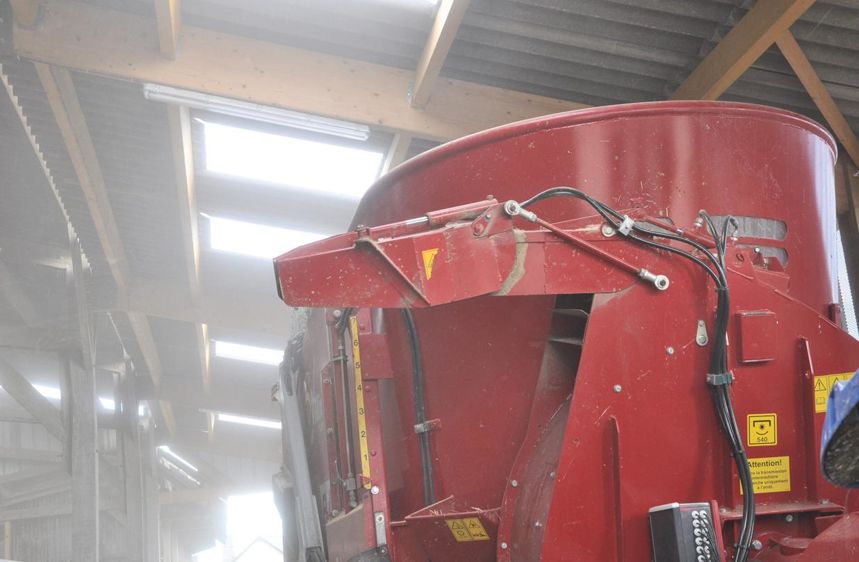 BVL PROPOSAIT DÉJÀ DES MÉLANGEUSES À VIS VERTICALE équipées d'un système de pailleuse. Ses nouvelles machines combinées disposent aujourd'hui d'une soufflerie encore plus puissante (la V-Confort Turbo), capable de pailler à 20 m avec un débit de 200 kg de paille/min. Ce gain de puissance est dû à un diamètre de soufflerie augmenté (1,50 m au lieu de 1,10 m), à un carter plus profond avec une hélice plus grande, et à un entraînement par arbre articulé et non plus par courroies. Ce nouveau concept d'entraînement, protégé par un embrayage à friction, permet d'avoir une structure plus compacte avec une soufflerie placée plus près de la trémie. L'engrenage pour l'entraînement de la soufflerie est commandé par câble Bowden mais une variante à commande hydraulique va suivre. L'éleveur a le choix entre une éjection directe, plus basse avec une meilleure trajectoire, ou une éjection avec goulotte pivotante à 190°. Cette soufflerie à paille peut être montée sur tous les modèles de mélangeuse V-MIX, à l'avant ou à l'arrière.