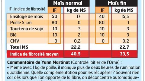 On en revient à un conseil classique avec les ensilages, surtout ceux pauvres en cellulose (moins de 190 g) et riches en amidon (plus de 300 g), l'association d'un fourrage riche en cellulose s'impose : ensilage d'herbe, enrubanné, méteil jeune, etc. Et la quantité de concentré ne doit pas dépasser 40 % de la ration.