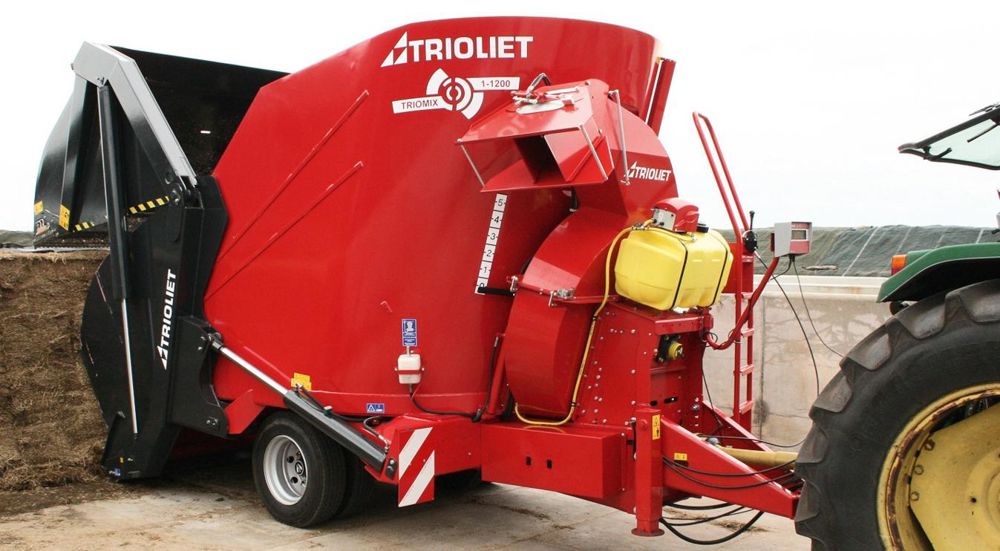 La Triomix P est la nouvelle mélangeuse-pailleuse à auto-chargement de Trioliet. Ce bol est capable de charger, mélanger, distribuer et pailler. La pailleuse mécanique située à l'avant de la mélangeuse peut souffler le fourrage sur une profondeur de 25 m, qu'il s'agisse de balles carrées ou rondes. En option, la pailleuse est équipée d'un injecteur d'eau qui limite significativement la quantité de poussières lors du paillage. La machine déssile elle-même par l'intermédiaire d'une porte arrière en forme de bec et munie de couteaux, qui laissent une coupe franche sur le front d'attaque. La Triomix P distribue par un tapis latéral à l'arrière. Sa capacité est de 12 m3 pour une puissance nécessaire à la prise de force de 82 ch.