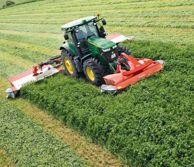 En complément aux modèles proposés en 8,10 m et 8,80 m, Kuhn agrandit son offre en combinés de fauche triple, avec la combinaison frontale FC 3525, et arrière FC 10030 qui atteint près de 10 m de largeur. La frontale FC 3525 offre une largeur de travail de 3,50 m. Le flux de fourrage peut aussi bien être déposé sur une grande largeur qu'en andains dont la largeur est réglable pour s'adapter à l'entre-pneus des tracteurs. La cinématique avec deux bras latéraux et un bras central autorise un débattement vertical de 70 cm pour un bon suivi du terrain. L'unité arrière FC 10030 est composée de deux groupes de fauche de 3,50 m. Leur écartement peut varier (pour obtenir une largeur de coupe totale de 9,50 à 9,90 m) afin d'assurer une largeur de surcoupe, qui peut atteindre 50 cm. Il se règle depuis la cabine. Le conditionnement du fourrage est confié à un rotor à doigts escamotables en acier. L'intensité est déterminée à la fois par le régime de rotation du rotor, qui se modifie au travers d'une boîte de vitesses, et par la présence d'une tôle à écartement réglable.