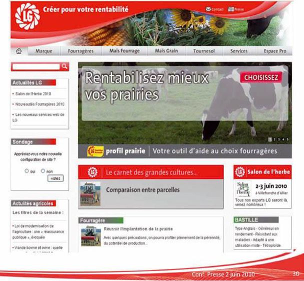 LES VENTES DE SEMENCES FOURRAGÈRES ont connu un recul de 37 % en trois ans. Ce sont les graminées qui ont le plus souffert (- 44 %), puis les légumineuses (- 7 %). Les mélanges fourragers ont mieux résisté (- 2 %). Les causes sont multiples : économiques, climatiques, etc. Face aux baisses des prix de leurs produits, les éleveurs ont choisi de différer le renouvellement de leurs prairies ou se sont orientés vers les semences de ferme ou premiers prix, quitte à se priver du progrès génétique offert par les nouvelles variétés. Selon l'Association des créateurs de variétés fourragères (ACVF), un ray-grass anglais permettrait un gain de 250 kg de lait par hectare et par an pour un investissement de 20 €/ha (surcoût de 4 € pour 25 kg/ha sur cinq ans). Le retour sur investissement ne se discute pas. LG dresse une perspective optimiste pour les prochaines années avec un rebond attendu de 20 à 30 % : « Les prairies vieillissent. Il faudra les refaire et l'herbe retrouve une certaine popularité : DPU herbe, préservation des sols et de l'eau, stockage du carbone, etc. Avant tout, l'herbe pâturée est de loin l'aliment le moins cher. » Deux espèces : ray-grass italien (23 %) et anglais (20 %) dominent toujours les ventes. Pourtant, avec quelque 64 variétés disponibles pour 12 espèces, sans compter les mélanges, l'offre LG en fourragères est très large. Pas toujours facile pour un éleveur de bien choisir avant de refaire une prairie. Sur son site (www.lgseeds.fr), le semencier propose un service gratuit pour lui permettre de pointer les espèces et les variétés les plus rentables pour son exploitation. Il s'agit du simulateur Profil-Prairie qui, en quelques clics, vous guide en fonction des caractéristiques du sol (pH, sensibilité au sec ou à l'excès d'eau) et du climat (hivernal et estival) vers le type de prairie le mieux adapté. Le simulateur va jusqu'à donner la valeur alimentaire attendue, donc un potentiel de production à l'hectare en litres de lait ou kilos de viande.