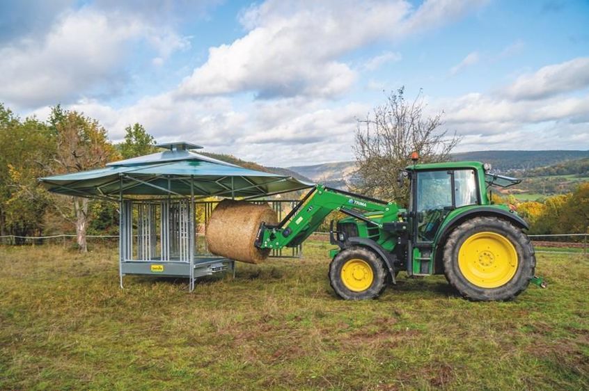 L’innovation de Patura consiste à assurer une alimentation en plein air combinée avec à un bien-être accru de l’animal. Grâce à une méthode de construction spéciale, le toit du râtelier bioclimatique a une surface totale de 36 m², qui offre une zone d’ombrage et de protection contre la pluie. Sa cheminée permet une ventilation naturelle laissant circuler l’air grâce au tirage thermique qui est perçue comme agréable par les animaux et éloigne également les mouches gênantes. Les animaux disposent ainsi d’un endroit à l’ombre et tempéré en périodes chaudes pour se nourrir, tout en se protégeant de la lumière directe du soleil ou de la pluie. Ce nouveau toit peut être combiné avec le râtelier carré Pro de Patura qui est disponible avec 6 cornadis différents. Un cadre de support, positionné sur le râtelier, a été développé pour surélever le toit bioclimatique et permettre son remplissage avec un tracteur. La structure du toit en métal, l’élément central de la construction, confère au toit bioclimatique une grande stabilité. Des segments latéraux ont été ajoutés pour agrandir la surface du toit afin de permettre une meilleure protection contre le soleil et la pluie. Ces segments latéraux sont dotés d’une bâche et peuvent être rabattus pour le transport sur route. Dimensions du toit déployé : 3,63 m x 6,75 m. Dimensions du toit rabattu : 3,63 m x 2,55 m. Poids du toit bioclimatique : 390 kg.