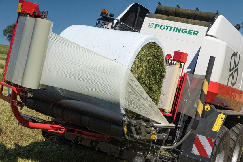 Pöttinger introduit une nouvelle fonction sur ses presses enrubanneuses Impress à chambre fixe et chambre variable : le système de liage est capable d’utiliser du filet ou du film. Le liage film assure une meilleure conservation de l’ensilage et une meilleure tenue dans le temps des balles. Le fourrage est ainsi mieux protégé, notamment lors de la manipulation et du transport des balles. Les balles liées avec du film sont aussi mieux comprimées : leur diamètre est inférieur de 3 cm par rapport à un liage filet, ce qui correspond à une réduction du volume d’oxygène dans la balle d’environ 70 litres. Cette quantité d’oxygène réduite assure une rapide baisse du pH, ce qui limite le risque de formation de moisissures.