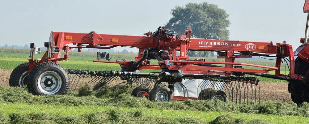 Pour l'andaineur Hibiscus 715 CD, les rotors sont constitués de dix bras porte-dents dont le chemin de came est réglable. Cela permet à l'utilisateur de libérer plus ou moins précocement le fourrage dans l'andain selon les conditions et la quantité de fourrage. Pour assurer un bon suivi du sol, Lely a mis en place un nouveau système en 3D : un roulement en Téflon permet aux deux roues sous les rotors à l'avant d'épouser le sol. Cela s'ajoute au pivotement de la connexion entre le châssis et le rotor pour que les peignes travaillent efficacement.