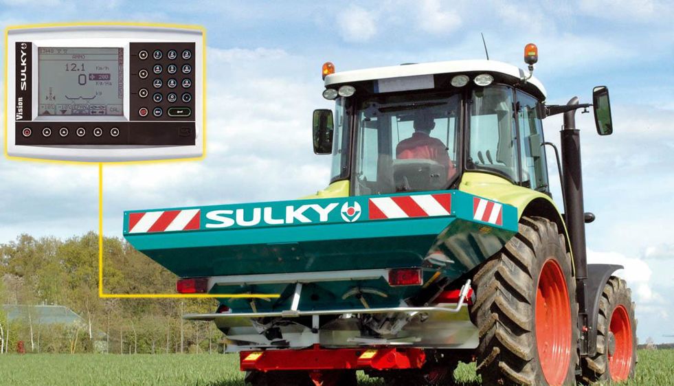 LA PESÉE AUTOMATIQUE GÉNÈRE des économies d'engrais. Présente sur les grandes exploitations, elle est désormais accessible à un plus grand nombre avec le distributeur d'engrais Sulky DPX28 Vision WPB, à moins de 10 000 euros. Le réglage de débit est automatique depuis la console Vision en cabine. Une cellule tout Inox, protégée à l'intérieur du châssis, informe en permanence du poids d'engrais en trémie. Les trappes d'écoulement sont gérées hydrauliquement et électriquement : les vérins électriques, très précis, gèrent la régulation du débit (DPA électronique), alors que l'hydraulique, plus rapide, se charge des ouvertures ou fermetures totales. La console Vision mémorise les réglages de huit produits et soixante-quinze chantiers différents. Ce DPX28 offre une largeur de travail réglable en continu de 12 à 28 m. Même les engrais de poids spécifique nettement inférieur à 1, comme l'urée granulée, peuvent être épandus sur 24 m de largeur. Grâce au DPX System à goulottes orientables, l'utilisateur n'a pas à intervenir sur les disques ni sur les pales de répartition. Pour l'épandage en bordure de parcelle, le dispositif exclusif Tribord, à commande depuis la console en cabine, fait partie de l'équipement de série. Ce distributeur d'engrais est disponible en 1 500 l, extensible à 2 100 l.