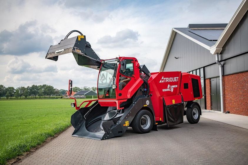 La mélangeuse Triotrac M de chez Trioliet se distingue par un système de coupe qui dépose le fourrage sur une plateforme équipée d’un rotor le poussant ensuite dans la cuve. L’absence de fraise sur le bras de chargement garantirait une coupe plus nette du front d’attaque, cela pour une meilleure conservation du silo. Le fourrage devant le silo est aussi facilement ramassé, assurant un travail propre avec moins de pertes de fourrage. D’après le constructeur, ce système de chargement s’adapte très bien aux balles rondes ou carrées ainsi qu’aux betteraves, pommes de terre, concentrés et minéraux. La capacité de la machine est de 14 m3 avec une seule vis verticale. Le moteur, de 175 ch, est placé à l’arrière et offre un accès facile et moins de bruit en cabine. La Triotrac M est aussi une machine compacte et maniable. Avec ses quatre roues directrices (en option) le rayon de braquage est de 10,5 m. Elle conviendra aux bâtiments exigus. Elle peut désiler jusqu’à 4,5 m de hauteur sur une largeur de 1,85 m. La cabine est réglable en hauteur afin d’assurer au chauffeur une bonne visibilité pendant les phases de chargement. La machine se commande par un joystick placé en bout d’accoudoir. Pour le déchargement, elle peut être équipée d’un tapis latéral à l’arrière ou de trappes de distribution des deux côtés.
