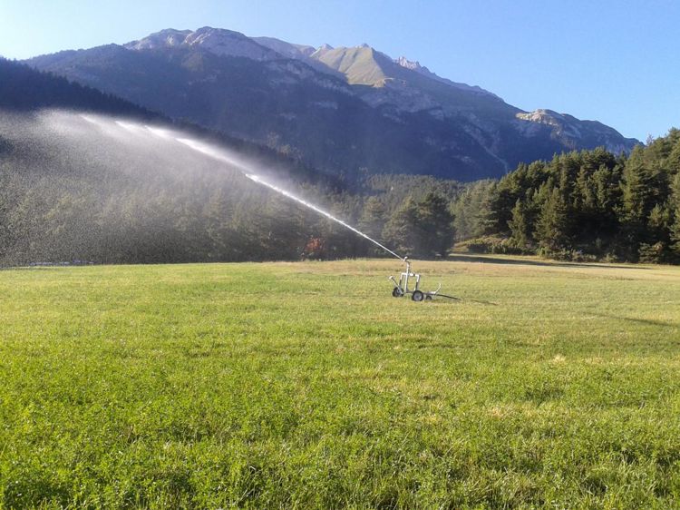 En Savoie, dans la Haute-Maurienne,l’été, alors que les troupeaux pâturent les estives d’altitude, l’arrosage, réservé aux meilleures parcelles de la vallée, sécurise la production des petites prairies.