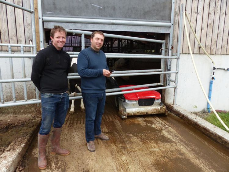 La programmation des deux robots répond à un objectif : une espérance de vie de la bouse de maximum une heure et demie devant les logettes. « C’est notre priorité pour maintenir les pieds des vaches et les logettes propres », dit David Féron. En contrepartie, les autres zones sont moins nettoyées : une fois toutes les deux heures et demie, etmême deux fois par jour pour les aires de repos et de tri à l’arrière des deux stalles de traite. C’est que les deux batteries gel ne permettent pas un fonctionnement 24 heures sur 24. Elles assurent 28 allers-retours avec un temps de recharge électrique de quarante minutes tous les deux allers-retours. Ces recharges en complètent deux autres, plus longues, d’une heure quinze minutes (à 13 heures et à 1 heure du matin). Les deux associés apprécient l’absence de « vague » de lisier, d’habitude créée par la poussée du racleur. « Les vaches ne sont plus gênées par son passage. Elles se sont bien habituées aux deux robots dont le gabarit (1,20 m de large sur 1,40 m de long et 61 cm de haut) est compatible avec sa présence dans le troupeau. Ils s’annoncent par un bip. » Et s’il bute dans un animal, il fait trois tentatives d’avancée et stoppe en cas d’échec. « En trois ans, nous avons assisté à un seul bug : il s’est arrêté à côté de la vache. »