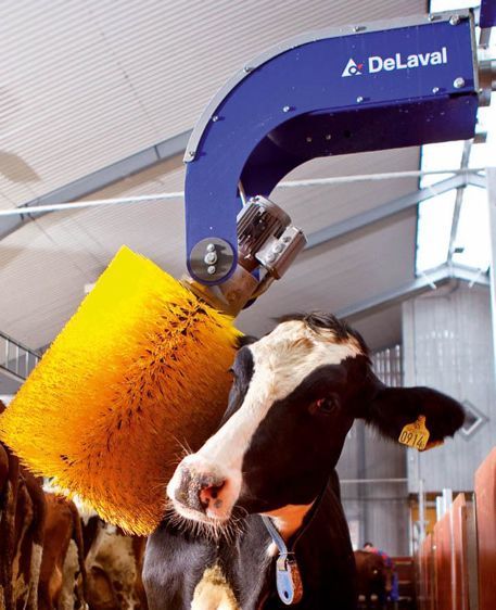 La brosse rotative SCB de DeLaval présente un nouveau design avec un support renforcé et deux points de pivot au lieu d'un : le premier sur l'axe de la brosse, l'autre au niveau du support. Cela permet un brossage plus souple que les vaches semblent apprécier puisqu'une étude de huit mois en Allemagne, testant différentes brosses, place la SCB en tête du classement. Un nouveau moteur et un nouveau réducteur avec un axe renforcé sont censés améliorer la fiabilité d'un équipement qui fonctionne 20 h/24 quand il est mis à la disposition d'un troupeau de 60 vaches. L'angle de balancement peut aller au-delà de 90°. Par rapport au modèle précédent la vitesse de rotation a été augmentée de 22 à 26 t/min, mais la consommation d'électricité est réduite de 25 %. Un bouton marche/arrêt près de la brosse facilite les opérations de maintenance. La brosse SCB possède le même système de sécurité avec une marche inverse et un arrêt automatique en cas de résistance.