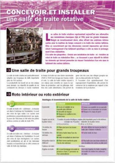 Les salles de traite rotatives représentent aujourd'hui une alternative aux installations classiques (épi et TPA) pour les grands troupeaux. Malgré un investissement élevé, elles offrent des solutions intéressantes pour la maîtrise du temps consacré à la traite. Elles se caractérisent par des dimensions souvent imposantes qui nécessitent l'aménagement d'un bâtiment spécifique à côté ou dans le prolongement d'une stabulation. Ce document a pour objectif de définir les éléments qui doivent permettre de réussir l'installation d'un roto.