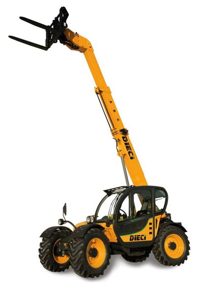La nouvelle gamme des télescopiques compacts Agri Farmer Dieci (2,8 à 3,2 t et 5,95 à 8,70 m de hauteur de flèche) est motorisée par Kubota (75 ch, 3,8 l, Tier 4i, avec filtre à particules). Mais la vraie nouveauté se situe sur la transmission hydrostatique (Vario System P-ECS) qui permet de passer de 0 à 35 km/h en continu. Cette transmission continue est reliée à une centrale électronique qui gère l'accélération du moteur selon les besoins de l'utilisateur. Le régime optimal pour réaliser les opérations demandées à la machine est continuellement calculé en fonction de la puissance nécessaire. Le conducteur n'a plus qu'à veiller sur les mouvements du chargeur. C'est la machine qui commande le moteur et non l'inverse. Le conducteur dispose de trois pédales : l'accélérateur, le frein et, tout à gauche, une pédale d'approche (inching) qui ralentit le déplacement du véhicule et sert d'accélérateur pour augmenter le débit hydraulique. La pédale d'accélérateur commande la vitesse de déplacement de la machine mais ne modifie pas le régime moteur. L'opérateur dispose aussi d'une gestion de la vitesse de déplacement et des tours du moteur avec deux potentiomètres : l'un qui règle le régime moteur minimum (un accélérateur manuel), l'autre qui détermine la vitesse maximale du chargeur.