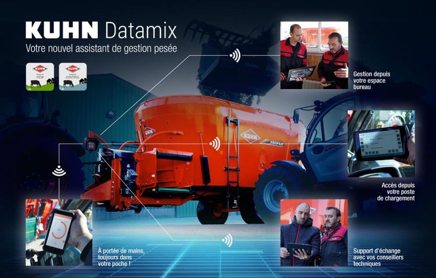 Le Datamix Control est une application téléchargeable sur téléphone portable ou tablette. Combiné à un module Wi-Fi placé sur le système de pesée de la mélangeuse, cet outil facilite les enregistrements des quantités chargées et distribuées par l’éleveur. Les informations sont saisies en direct depuis le tracteur ou le télescopique, puis mémorisées sur le réseau. Ces données sont partageables avec les autres associés et les salariés de l’exploitation. L’application offre ainsi une traçabilité de la ration par lots d’animaux. Le chauffeur peut ajouter d’autres informations comme une mesure des refus constatés après chaque distribution. Par sa simplicité d’utilisation, sa mobilité et la possibilité d’exporter ou partager les informations, cette solution va donc plus loin que la plupart des fonctions offertes sur les consoles en cabine des mélangeuses.