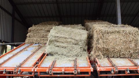 La SCL Novalait a choisi des convoyeurs à chaînes qui accueillent les balles de foin carrées. Ils alimentent un bol équipé de couteaux pour couper les fi bres avant qu'elles passent dans la mélangeuse.