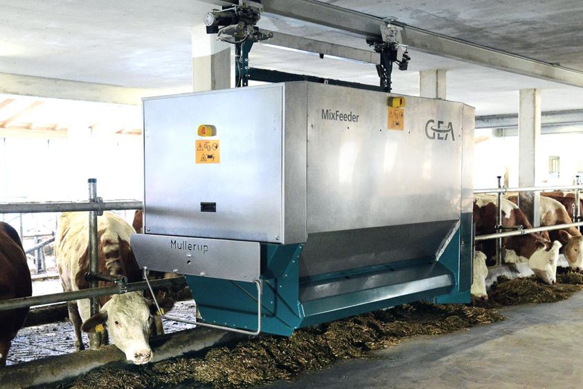 Chez GEA, la majorité des robots d’alimentation commercialisés sont conçus sur la base d’un wagon de distribution circulant sur rail. Le Mix & Carry se compose également de banques de stockage et d’un bol de prémélange. Cette version est prévue pour des troupeaux jusqu’à 1 000 têtes. Le Mix Feeder est un modèle un peu plus petit, comprenant aussi des stockeurs et un mélange dans le wagon de distribution. Il convient à un troupeau de 350 animaux. Le Free Stall Feeder est destiné à l’emploi de fourrages secs ou déjà prémélangés. Il est recommandé dans les zones fromagères en AOP. Sa capacité va jusqu’à 700 animaux. Enfin, le Belt est un concept différent où la distribution est assurée par un tapis convoyeur. Une solution intéressante pour les bâtiments où le parcours du robot serait trop complexe. Il peut nourrir jusqu’à 700 animaux.