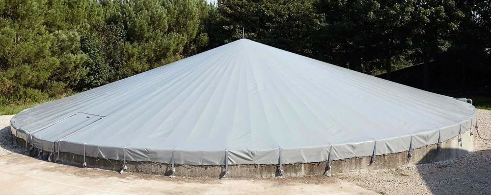 Pour limiter les odeurs et les dilutions par l'eau de pluie, Chapo est un système complet de couverture pour fosse circulaire d'un diamètre de 30 m au maximum. Le tout est installé par les monteurs Intermas. La couverture est assurée par une bâche en polyester enduite de PVC, spécialement mise au point pour sa résistance aux agents alcalins et acides issus de la fermentation. Elle est garantie dix ans. Des sangles de soutien, des oeillets et sandows, et une structure de soutien par des supports en résine assurent la solidité du système.