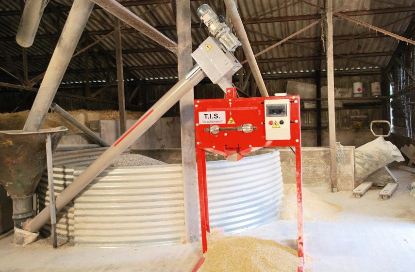 LA SOCIÉTÉ TIS (LOIRE) A CONÇU UN ÉQUIPEMENT ROBUSTE pour valoriser les céréales à la ferme. Il se compose d'une vis orientable de 3 mètres qui amène le grain dans un alimentateur. Celui-ci contient un épierreur : un crible rotatif qui trie tous les corps étrangers dont la taille est supérieure à celle du grain. Un piège à aimant retire tous les éléments ferreux. En option, il peut également être équipé d'un dépoussiéreur. Le grain ainsi débarrassé des impuretés se déverse ensuite dans l'aplatisseur, où il passe entre deux cylindres massifs de 300 mm de diamètre, qui autorisent un débit de 1 t/h. Un levier permet de régler l'écartement des cylindres selon la taille du grain (maïs, blé, avoine). La conception mécanique de cet outil permet également de traiter des céréales humides. À partir de l'armoire de commande, il est possible de synchroniser la mise en route et l'arrêt automatique de l'alimentateur AL16 et de l'aplatisseur AP16H. L'ensemble représente un investissement de 6 000 €. En remplacement de l'alimentateur, l'aplatisseur peut être équipé d'une trémie pour 4 000 €.