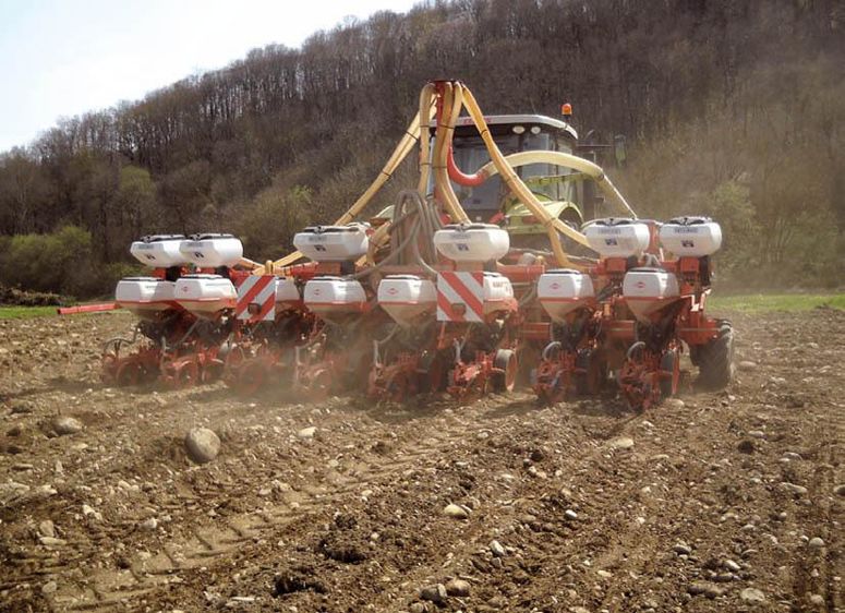Ce nouveau semoir monograine Maxima RX (repliable) a été conçu pour les conditions pierreuses. Avec les roues à l'avant du semoir, les pierres ne se coincent pas entre les éléments semeurs et ne perturbent pas le semis. Ce matériel peut recevoir huit rangs à 70, 75 ou 80 cm d'écartement pour une largeur de travail de 36 m. Il a une largeur de transport sur route de 3 m. Pour une utilisation dans les pentes souvent liée à des conditions pierreuses, le semoir est conçu en trois parties indépendantes, pour bien s'adapter aux dénivellations du terrain. Afin d'assurer un semis à profondeur constante, le Maxima RX a une pression au sol qui atteint 150 kg. Ainsi, l'élément semeur est stable et ne pianote pas. Livrable avec les éléments semeurs Maxima RX, ce nouveau châssis peut être équipé des nombreuses options de la gamme Kuhn.