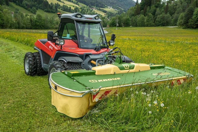 Dans les terrains en pentes, et particulièrement en montagne, la faucheuse frontale a naturellement tendance à glisser vers le bas quand le tracteur travaille en dévers. Krone propose pour cela un système de déport hydraulique du lamier pour corriger ce phénomène, avec la particularité de ne pas affecter le fonctionnement des cardans primaires ou secondaires. Un décalage de 15 cm d’un côté comme de l’autre est possible en utilisant un distributeur en cabine. Cela évite notamment au chauffeur de chercher à décaler sa faucheuse en jouant sur la direction. La mise en ligne de la machine replace le cardan primaire dans l’axe qui travaille ainsi sans risque d’usure prématurée au niveau de ses éléments. Le cardan secondaire s’allonge ou se raccourcit mais toujours sans contrainte. Le constructeur insiste sur cette différenciation avec laquelle il compte se démarquer de ses concurrents.