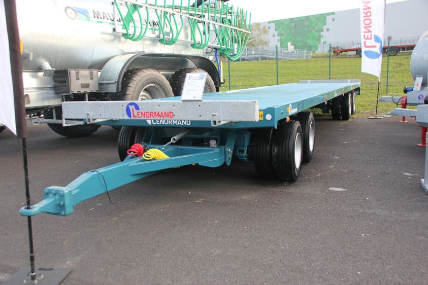 Dévoilé au Sommet de l’élevage, le nouveau plateau fourrager Lenormand de 12 m de longueur est équipé de 8 roues réparties sur quatre essieux. C’est l’une de ses particularités puisque le train avant pivotant est monté sur un essieu double de type tandem. Toutes les roues de dimensions 445/45 R 19,5 sont jumelées afin d’améliorer la portance et de limiter le tassement du sol. Les essieux sont surbaissés pour que la hauteur du plancher ne dépasse pas 105 cm.