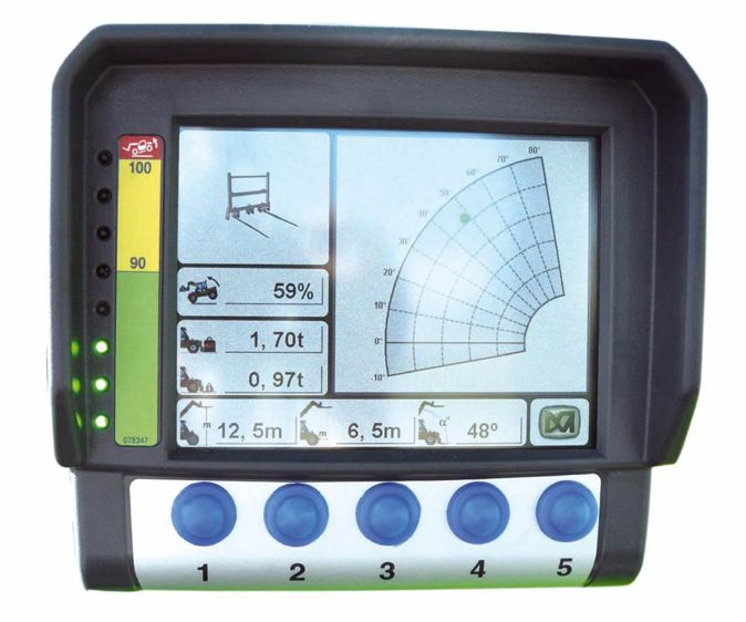DEPUIS 2010, TOUS LES TÉLESCOPIQUES doivent répondre à la réglementation EN 15 000 censée améliorer les risques de basculement vers l'avant en limitant certains mouvements. Ce système, appelé « coupure des mouvements aggravants », peut être désagréable pour l'utilisateur dans le travail quotidien de manutention. Le système de contrôle dynamique du chargement M CDC, conçu par Merlo, cherche à offrir plus de praticité, avec notamment un écran en cabine qui permet à l'opérateur de surveiller en temps réel le degré de sécurité dont il dispose. Ce contrôle dynamique utilise plusieurs paramètres : la charge (capteur sur le vérin), la sortie et l'angle d'inclinaison du bras, et un mécanisme de reconnaissance automatique de l'équipement. En effet, tous les équipements qui sortent des usines Merlo sont dotés d'un capteur de reconnaissance qui s'interface avec le capteur du tablier pour identifier l'outil durant la phase d'accrochage. L'outil attelé s'affiche sur l'écran ainsi que l'indice de stabilité (en pourcentage), la position graphique du chargement, le poids net, le poids brut et la configuration géométrique du bras. D'un seul coup d'oeil, l'opérateur sait s'il est en position de sécurité autorisant la vitesse maximale des mouvements ou en position de pré-alarme avec vitesse des mouvements ralentis. En cas d'utilisation d'outils sans capteur, un sélecteur permet de choisir trois grands types d'équipement en fonction de la distance de la charge au tablier. La réglementation autorise une désactivation du blocage des mouvements aggravant pour des tâches particulières comme le terrassement. Le système M CDC permet cette désactivation par un simple sélecteur et informe le conducteur par une couleur différente sur le diagramme de charge. Sur l'écran en cabine, l'opérateur bénéficie des informations de pesées des charges transportées avec le poids net instantané, la visualisation des vingt dernières pesées et les cumuls des poids.