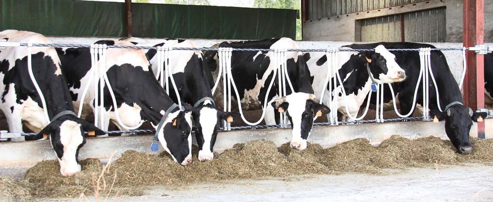 CETTE BARRIÈRE DE NOURRITURE EST COMPOSÉE DE DEUX CÂBLES Deltex gainés souples, tendus en position horizontale par deux systèmes de tension à vis, placés tous les cinq ou six mètres selon les bâtiments. Sur ces deux câbles espacés de 80 cm sont fixés des éléments en câble composite Deltex pour installer sept ou huit places individuelles à l'auge tous les six mètres. Ces câbles Deltex ont l'avantage de ne pas être conducteurs, ni chauds en été ni froids en hiver. Ils sont agréables au toucher et surtout silencieux comparé aux systèmes de cornadis métalliques. Ce principe de barrière offre davantage de confort aux vaches en supprimant les chocs contre des éléments rigides. Pour les bâtiments taurillons, Deltex propose un système de deux ou trois câbles horizontaux avec réglage de la hauteur à l'auge par une seule personne.