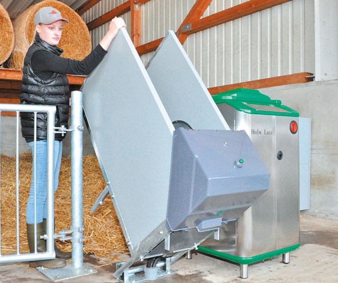 CETTE NOUVELLE STATION RACCORDÉE AU DISTRIBUTEUR AUTOMATIQUE DE LAIT HL100 de Holm & Laue est présentée comme innovante sur plusieurs points. Ici, la tétine et le tuyau à lait sont nettoyés après chaque buvée afin qu'aucun dépôt de lait ne se forme. Le tuyau à lait est aussi nettoyé deux fois par jour avec de l'eau chaude additionnée d'une lessive. Sous la tétine se trouve un bac qui recueille les restes de salive et d'eau de rinçage et les évacue hors de la station. La tétine est inclinée vers le bas à 45°, et non pas horizontalement. Ce détail reproduirait le comportement naturel du veau qui a ainsi la tête tendue pour stimuler le réflexe de la tétée. Dès qu'il prend la tétine, une petite quantité de lait s'écoule dans sa gueule pour l'inciter à téter et simplifier l'initiation. Plus étonnant, la tétine est équipée d'un éclairage LED, ce qui aiderait le veau à mieux s'orienter et augmenterait le nombre de buvées pendant la nuit. Enfin, cette station Hygiène pivote vers le haut à 90° de façon à faciliter son nettoyage. Jusqu'à quatre stations Hygiène peuvent être raccordées à un seul Dal pour une capacité de cent cinquante veaux.