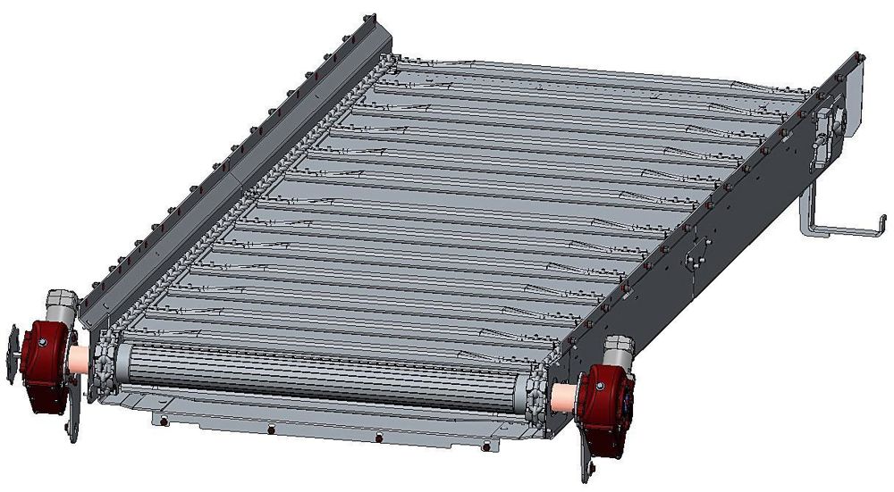 L'arbre principal du tapis est entraîné non pas par un seul moteur hydraulique, comme sur un montage classique, mais par deux moteurs.