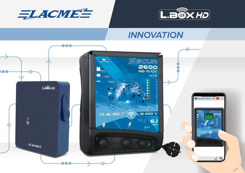 Lacmé présente une nouvelle génération de clôtures électriques connectées. L’innovation majeure est la L.BOX HD, simple à installer et qui communique à haute distance avec les électrificateurs connectés. Elle se branche directement sur la box du fournisseur internet, via un câble réseau. Il suffit ensuite de placer les électrificateurs n’importe où, jusqu’à deux kilomètres d’éloignement. Grâce à l’application gratuite de Lacmé, l’éleveur télécommande ses postes de son smartphone. Il visualise leur bon fonctionnement et reçoit des notifications en cas de dysfonctionnement ou de manque d’efficacité de l’installation. Il a accès à la tension de garde de chaque appareil en temps réel et à une courbe de l’historique de ces tensions afin de voir l’évolution de l’état de la clôture et anticiper ainsi son vieillissement.
