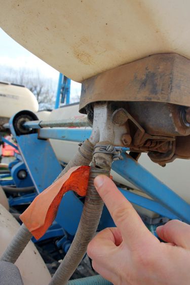 © D. L. - t Tuyaux. La tuyauterie s’abîme avec le temps, notamment au niveau des colliers de serrage. Suivez chaque circuit et vérifiez qu’ils ne sont pas coupés. Changez-les au besoin. Un petit trou dans un tuyau pneumatique provoque une perte de dépression et une mauvaise répartition des graines.