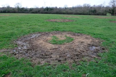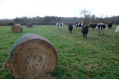 Avant de basculer sur cette organisation, l’étape préalable a été de grouper les vêlages au printemps afin de fermer la salle de traite en janvier et février. Durant cette saison hivernale, les éleveurs sélectionnent une prairie dégradée parmi les terres drainées de l’exploitation (70 % de la surface). Ils découpent la parcelle de trois à quatre hectares en huit paddocks couloirs, et disposent une quinzaine de bottes de foin sur chacun. Chaque paddock ainsi constitué doit subvenir aux besoins des vaches laitières durant une semaine environ. « Nous prévoyons une botte pour une dizaine de vaches au maximum, expliquent-ils. Nous avons fabriqué des râteliers à l’aide de tuyau PVC de diamètre 25 mm et de rouleaux pour le film d’enrubannage. Ils sont légers et faciles à déplacer manuellement par une personne seule. Nous avons fait sans râtelier la première année mais les vaches poussent les bottes ! » Chaque jour, au fur et à mesure de la consommation du foin, les vaches sont déplacées à l’aide d’un fil avant et d’un fil arrière. L’objectif est qu’elles ne piétinent pas trop le terrain et que les bouses soient réparties le mieux possible sur l’ensemble de la parcelle. « Les pertes de foin dépendent des conditions climatiques, observent les éleveurs. Nous pensons qu’elles ne sont pas trop supérieures à celles que l’on observe en râteliers ou aux cornadis. De plus, ce foin n’est pas vraiment perdu puisqu’il retourne au sol pour l’enrichir. C’est aussi un moyen de répandre dans la prairie les semences prairiales contenues dans les bottes. »