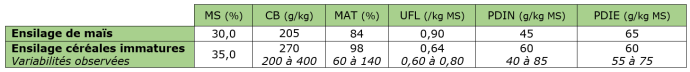 Tableau 1 : Principales valeurs nutritionnelles des ensilages de maïs et de céréales immatures