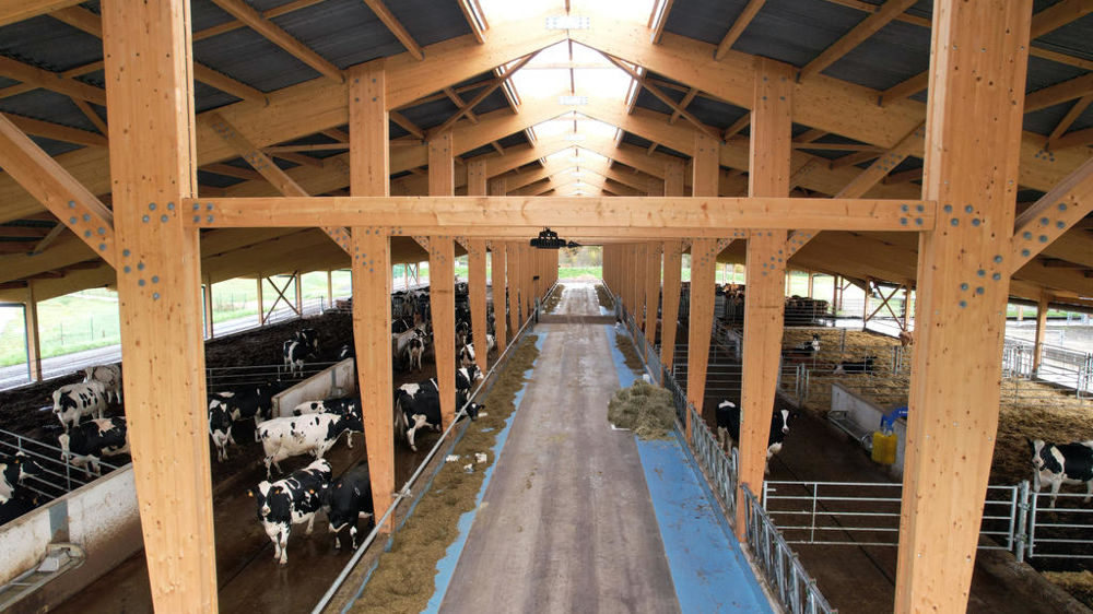« Les bâtiments laitiers tout ouverts en litière malaxée cochent les cases de la transition écologique, s’enthousiasme Pierre Alonso, de l’entreprise James, spécialisée dans les charpentes en bois lamellé-collé. Ils consomment moins de béton et de tubulaires que les bâtiments en logettes pour plusieurs raisons. Les murs sont moins hauts pour favoriser l’entrée de l’air et sécher la litière. Il y a moins de murs à l’intérieur du bâtiment et moins de couloirs puisque les vaches sont sur une aire de couchage. » Pierre Alonso a participé à la réflexion pour la construction de la stabulation laitière en litière malaxée de la Ferme de la Tremblaye, dans les Yvelines.